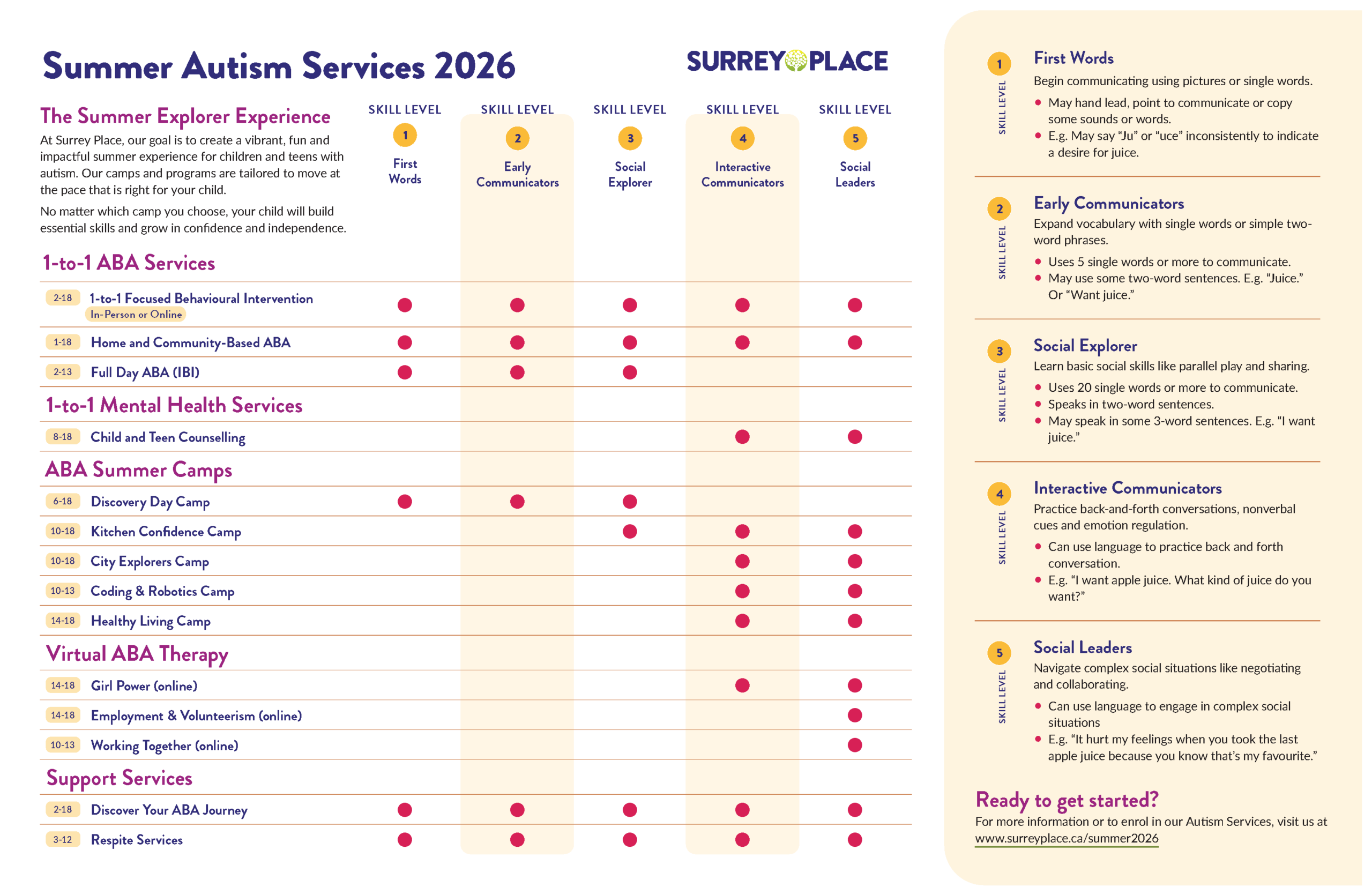Every season, Surrey Place offers a selection of paid Autism Services options. This can be a lot of information to navigate, particularly if you’re new to our services. That’s why Surrey Place has developed a rubric to help you understand which group will best support your family’s needs. Use this tool to find a service that aligns with your child’s goals and skill level.